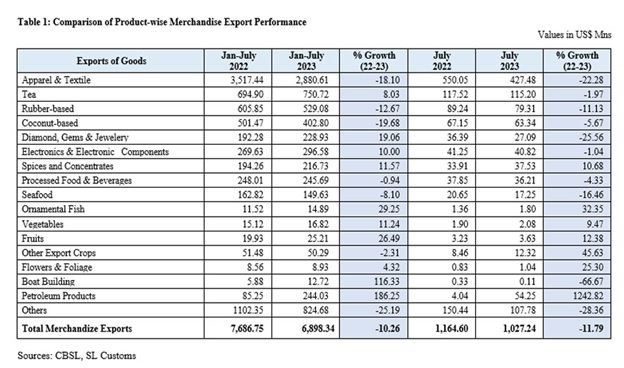 Sri Lanka’s merchandise exports increased by 2.18 % to US$ 1,027.2 Million in July 2023 compared to June 2023 as per the provisional data released by Sri Lanka Customs. However, it is an 11.79 % decrease when compared to the value recorded in July 2022.