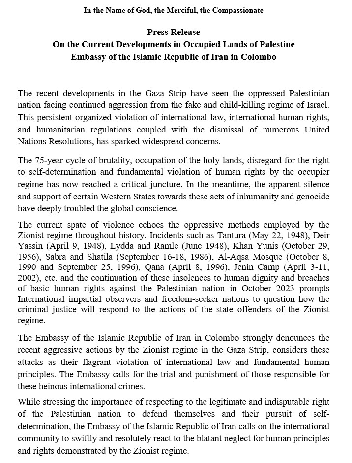 The Embassy of the Islamic Republic of Iran in Colombo, while considering the actions of the Zionist regime in occupied Palestine as an obvious violation of international laws and a gross, continuous, and systematic disregard for humanitarian law and the fundamental principles of human rights, emphasizes the following: