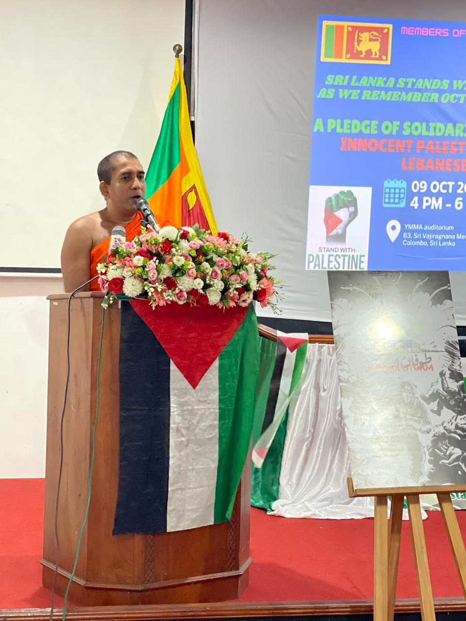 A commemoration ceremony marking the anniversary of the Al-Aqsa Storm and the martyrdom of Seyyed Hassan Nasrallah and General Nilforoushan was held by the Free Palestine NGO, with the participation of Ambassadors of Iran and South Africa, Buddhist clerics, political activists, and media representatives in Colombo (October 9, 2024).