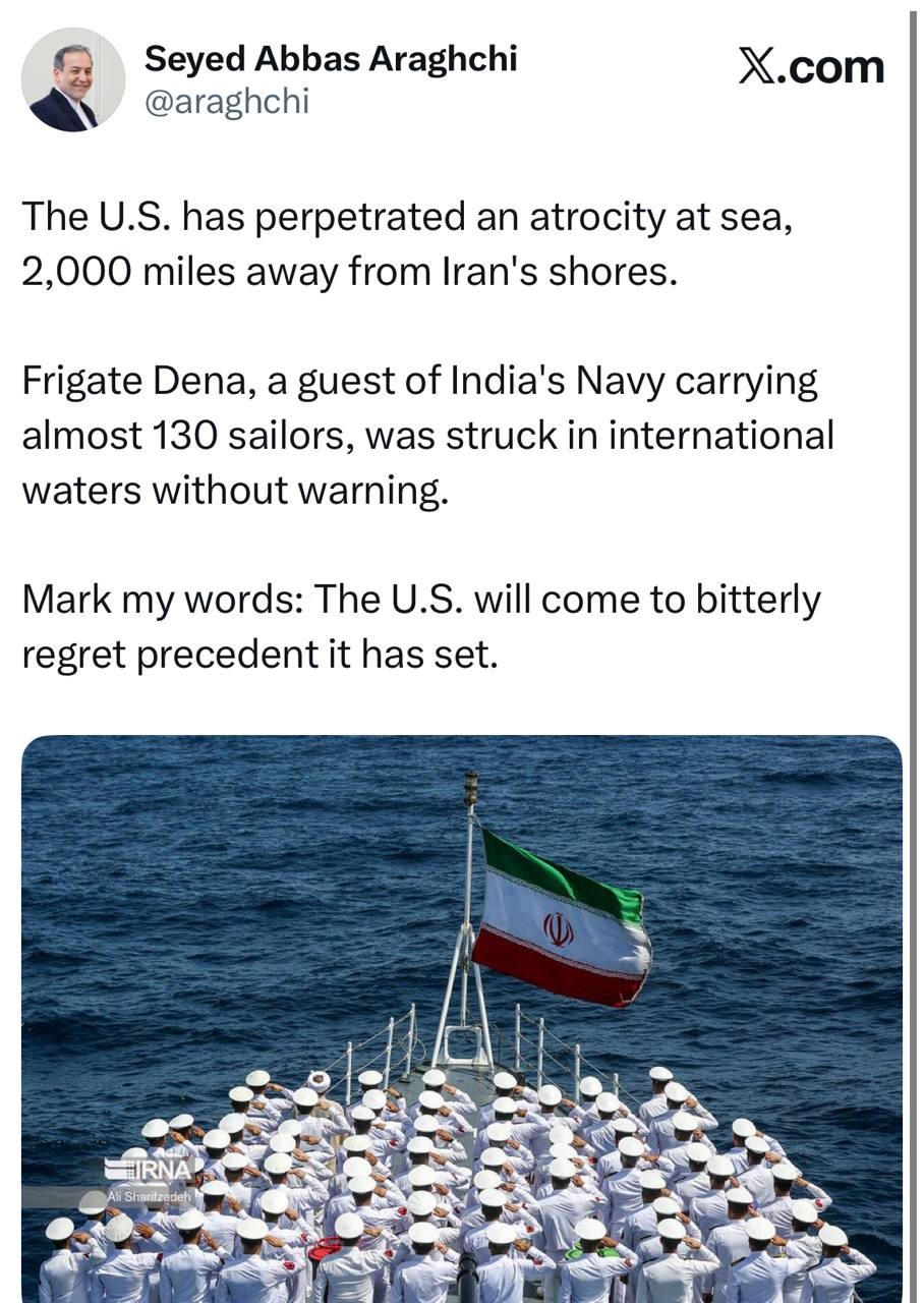 سید عباس عراقچی وزیر امور خارجه کشورمان در پیامی در شبکه ایکس در واکنش به جنایت فاجعهبار آمریکا در هدف قراردادن ناوچه «دنا» نوشت: