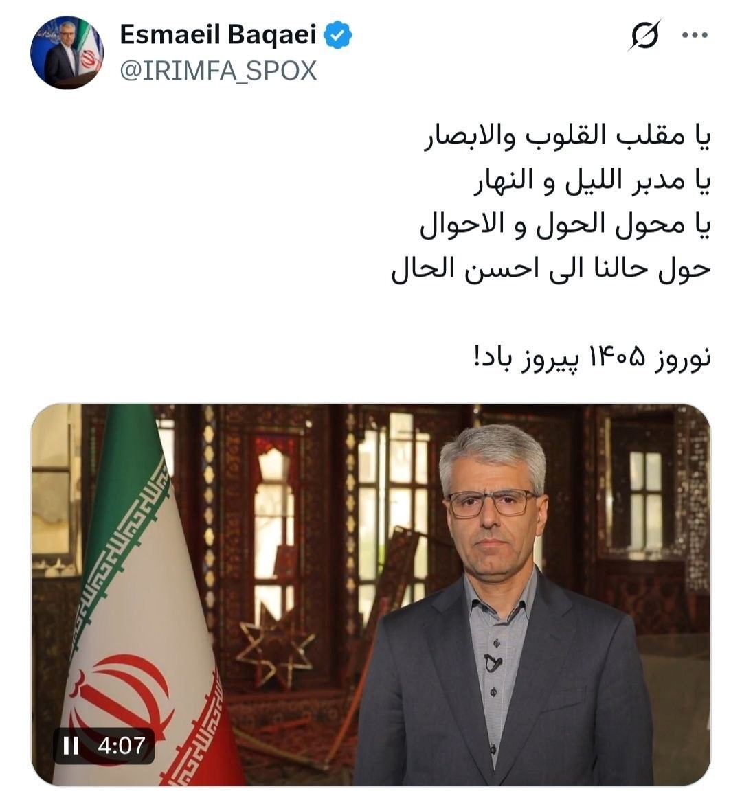 پیام نوروزی ۱۴۰۵ اسماعیل بقائی سخنگوی وزارت امور خارجه جمهوری اسلامی ایران